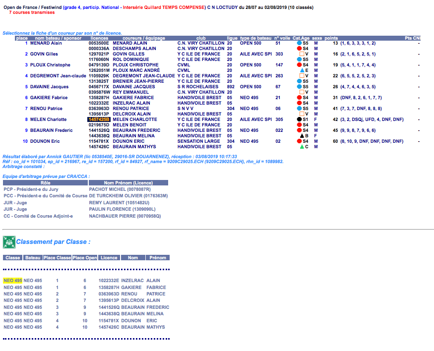 Du du 28/07/2019 au 02/08/2019 (10 Classés / 4 Neo495) – Grade 4 - 7 Courses transmise