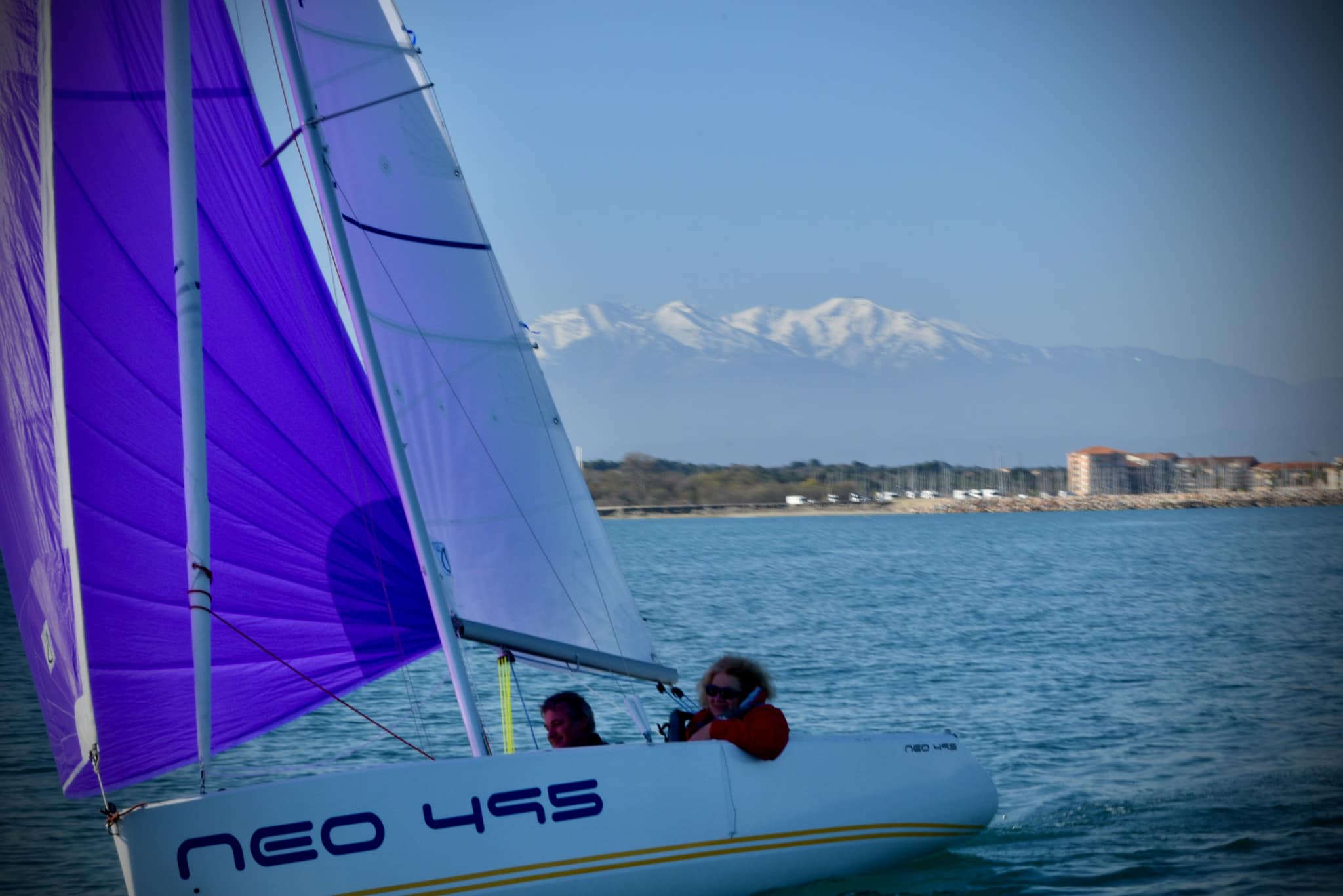 « Il est enfin arrivé notre 1er Néo 495 ! Installée à babord, Marc, le moniteur du club Nautique de Collioure, me lance un « tu montes ? » En cet automne naissant de 2021, notre « Migjorn » file au gré d’une brise régulière vers son port d’attache. Au cœur des éléments, le Canigou enneigé pointe au lointain de la côte sableuse, puis la côte rocheuse nous accueille. Nous hissons le gennaker d’un superbe violet qui s’unit à merveille avec les teintes fauves du paysage de la baie de Collioure. Je goûte depuis et chaque semaine le plaisir de voguer, grâce à ce bateau adapté qui permet à mes muscles de le manier, de jouer avec l’onde et le vent. Liberté.